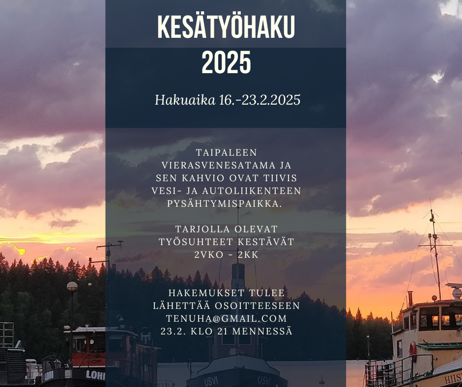 Hei sinä 15-17-vuotias nuori, tule meille kesätöihin! Tarjoamme mielenkiintoisen kesätyön Varkauden Vierasvenesatamassa kahdeksi viikoksi. Haethan paikkaa pian ja viimeistään 31.3. Avoimen hakemuksen voit lähettää sähköpostilla osoitteeseen tenuha(a)gmail.comKesäduuni
